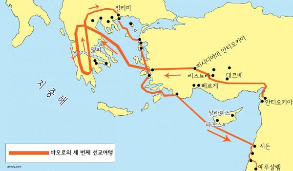 사도 행전 18장 23절부터 21장 16절은 제3차 전도 여행기이다. 바오로는 제2차 전도 여행 때 설립한 갈라티아 지방의 교회들을 돌본 다음 아시아 지방의 수도 에페소로 가서 27개월 가까이 활약하였다(사도 19,8-10 : 20,31). 안티오키아에 돌아온 바오로는 그곳에서 잠시 머문 뒤에 다시 세 번째 선교여행을 떠났다. 제3차 선교여행에서는 먼저 갈라티아와 프리기아를 거쳐(18,23), 에페소에 이르렀다. 에페소는 소아시아주의 수도로서 인구가 많은 도시였다. 이 곳은 특히 기원전 5백년경에 활동했던 자연 철학자 헤라클레이토스(Herakleitos)의 고향으로도 유명하였다.