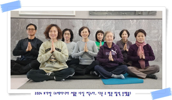 지난 봄 가을을 우리는 잘 지내 왔습니다. 요가를 하면서 또 체조로 몸을 다지면서 우리는 건강하게 지내 왔습니다. 그렇게 하면서 우리 모두는 영육간의 건강을 잘 지켜 올 수 있었기에 깊은 감사를 드리며 왔습니다. 거기에는 주님의 놀라우신 축복이 함께 해 주셨기에 그 Amazing Grace에 감사를 드리는 바이며, 또한 늘 함께 하여 주시며 격려해 주신 본당 신부님께도 깊은 감사의 말씀 전합니다. 누구 보다도 무료 지도 봉사를 하여주신 요가반의 김남희 스테파니아 선생님과 체조반의 김유진 그레이스 선생님, WE ALL LOVE YOU !