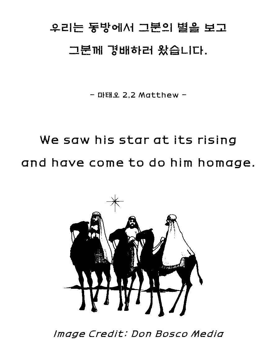 (01.04.2026 주일Sunday) 주님 공현 대축일 The Epiphany of the Lord January 3, 2026 오늘의 말씀 Word of the Day 클릭하여 주십시오 한국어 읽기 (마태오 2,1-12) 한국어 듣기(마태오 2,1-12) English Reading (Matthew 2:1-12) English Podcast (Matthew 2:1-12) 오늘의 강론 강론 듣기 – 클릭해 주세요
